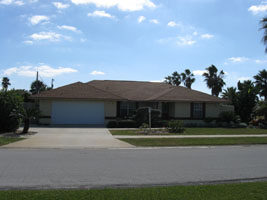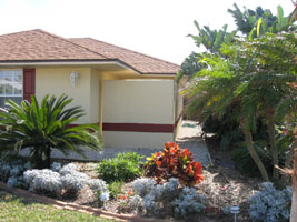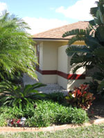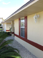 Complete exterior repaint including rebuild of wide stucco bands, rusted metal repair and use of dark wine-red trim color.