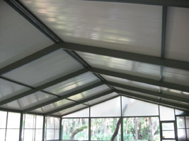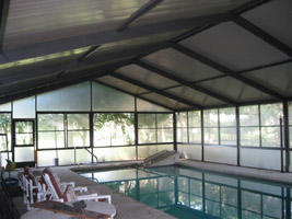 Complete exterior repaint of large aluminum pool enclosure in medium brown and dark brown / bronze including thorough prep of corroded aluminum surfaces and replacement of rusted zinced metal screws with stainless steel screws.